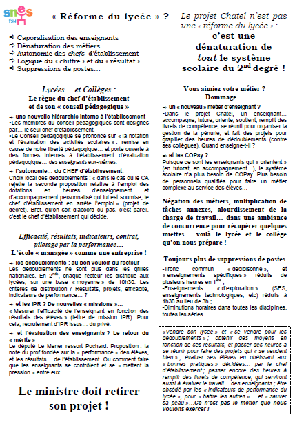 Vous êtes ici : Accueil A classer Système educatif Réforme du lycée 2018 Précédentes réformes du lycée Réforme Chatel Documents pour les collègues, parents, élèves Tracts sur la réforme à destination des enseignants 6 décembre 2009 A classer Tracts sur la réforme à destination des enseignants Partager cet article : Cliquez sur la vignette pour télécharger le tract : Tract 1 Tract 2 Tract 3 - zizanie