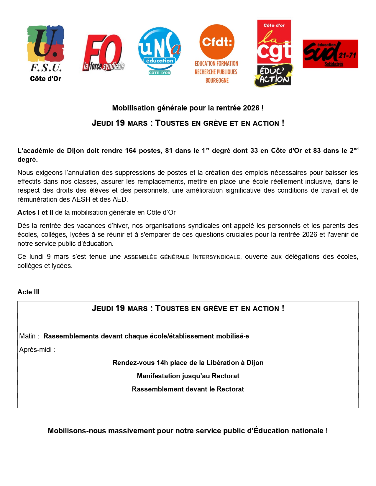 L’académie de Dijon doit rendre 164 postes, 81 dans le 1er degré dont 33 en Côte d’Or et 83 dans le 2d degré, c’est inacceptable !