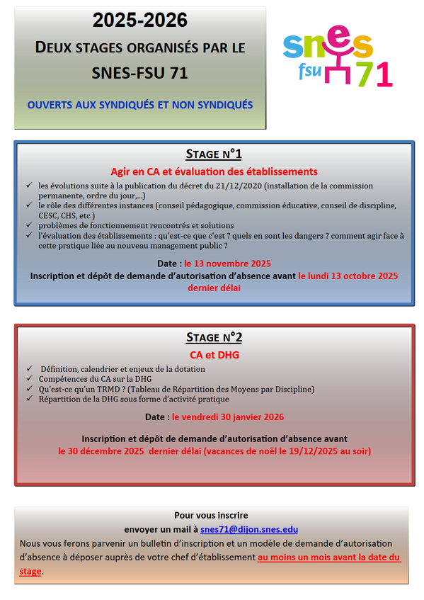 Le stage syndical « CA et DHG » se déroulera le vendredi 30 janvier 2026 de 9h à 17h à la Maison des Syndicats de Chalon sur Saône (salle 2).